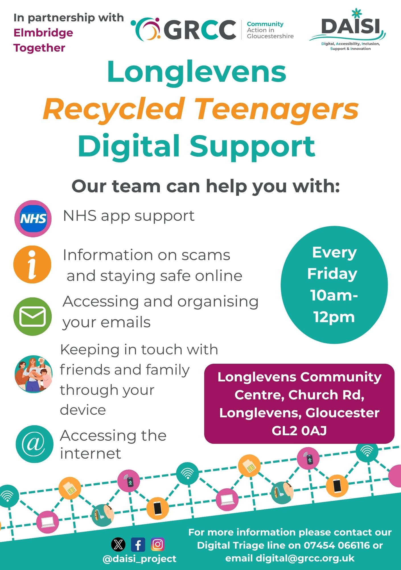 Plus fortnightly or monthly at: Highnam, Shurdington, Ebrington, Gotherington, Stow-on-the-Wold, Northway, Tewkesbury, Churchdown, Chipping Campden, Ruspidge, Cinderford, St Oswald's Gloucester, Kingsholm Gloucester, Matson, Bishop's Cleeve and Berkeley : email digital@grcc.org.uk or call 07454 066116 for dates/times. |